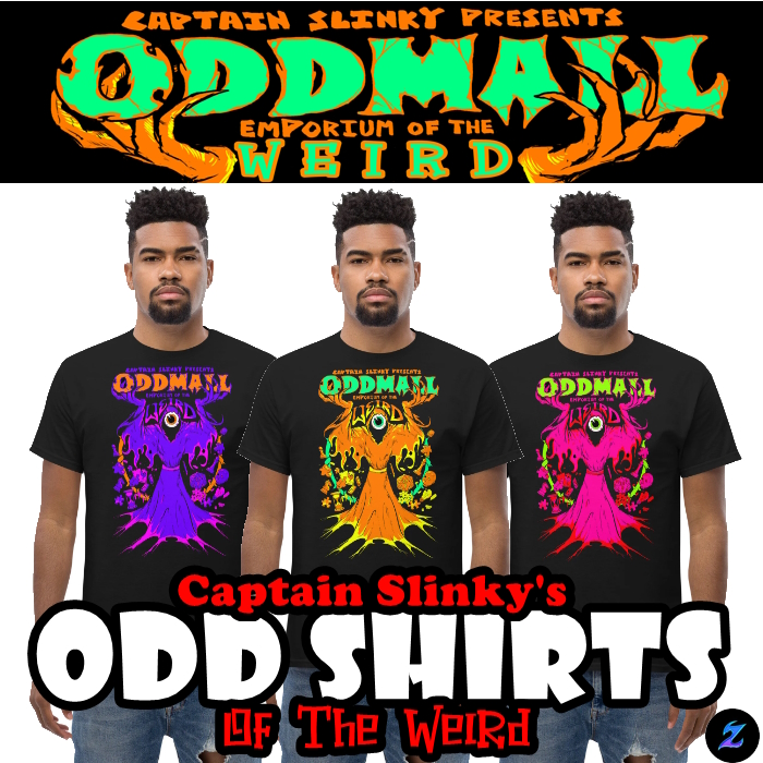 Captain Slinky Presents Oddmall Emporium of The Weird “SPRUNG” T-Shirts available in our Etsy shop till the day after SPRUNG (May 1st)! Look at that gorgeous Zachary “Goodbye Zach” Diaz artwork! And he gave us THREE COLOR OPTIONS, too! I couldn’t decide which one I liked best, so I put them all up for sale! Click the image or go directly to https://www.etsy.com/shop/captainslinky to order yours in sizes all the way up to 5XL because I am a Big Boi and I need a Big Shirt! The 4XL fits me great! And we keep these shirts cheap by placing our profit margin *low* on them, I think we make like a buck per shirt? Go get one! Let everyone know that YOU were at ODDMALL!