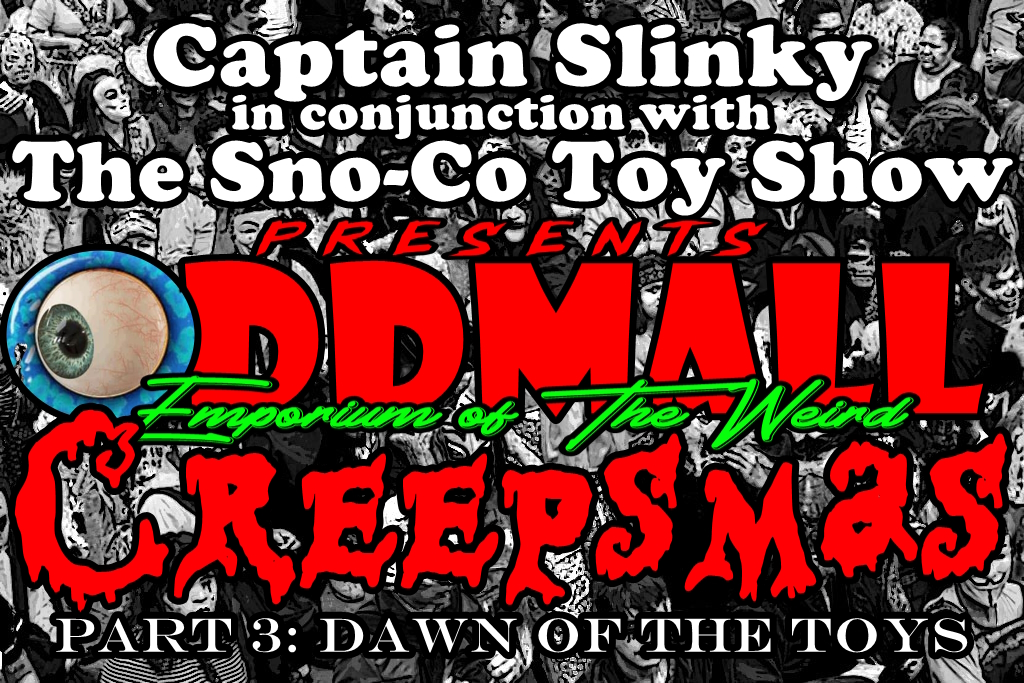 The Captain Slinky Presents Oddmall Emporium of The Weird SPRUNG Art, Craft, Gift & Gaming Show Vendor Applications are once again OPEN and we are READY to take your applications! Visit http://www.oddmall.co/sprung2apply today! “But Captain,” I hear you saying to your screen, “What does THAT have to do with that big image up there that says Captain Slinky in conjunction with The Sno-Co Toy Show Presents Oddmall Emporium of The Weird CREEPSMAS Part 3: Dawn of The Toys?