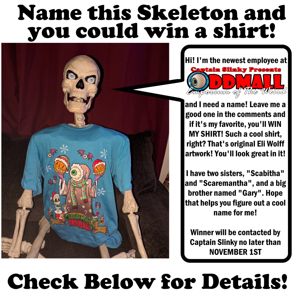 WIN A FREE SHIRT!!! Just comment below with your best name for this life-size Skeleton (pictured above) and we’ll pick our favorite ON HALLOWEEN to win an official 2024 Captain Slinky Presents Oddmall Emporium of The Weird CREEPSMAS T-SHIRT featuring gorgeous, exclusive artwork by local artist and alleged “Rizzler” Eli Wolff in whatever size you need (sizes larger than 3xl are printed on grey shirts)! We’ll either mail it to you, or you can just pick it up at the @cCaptain Slinky Presents: Oddmall Emporium of the Weird Creepsmas 4! Art, Craft & Gift Show November 9-10 at the Evergreen State Fairgrounds in Monroe, WA, where anyone who DIDN’T win can purchase any size shirt for just $10!