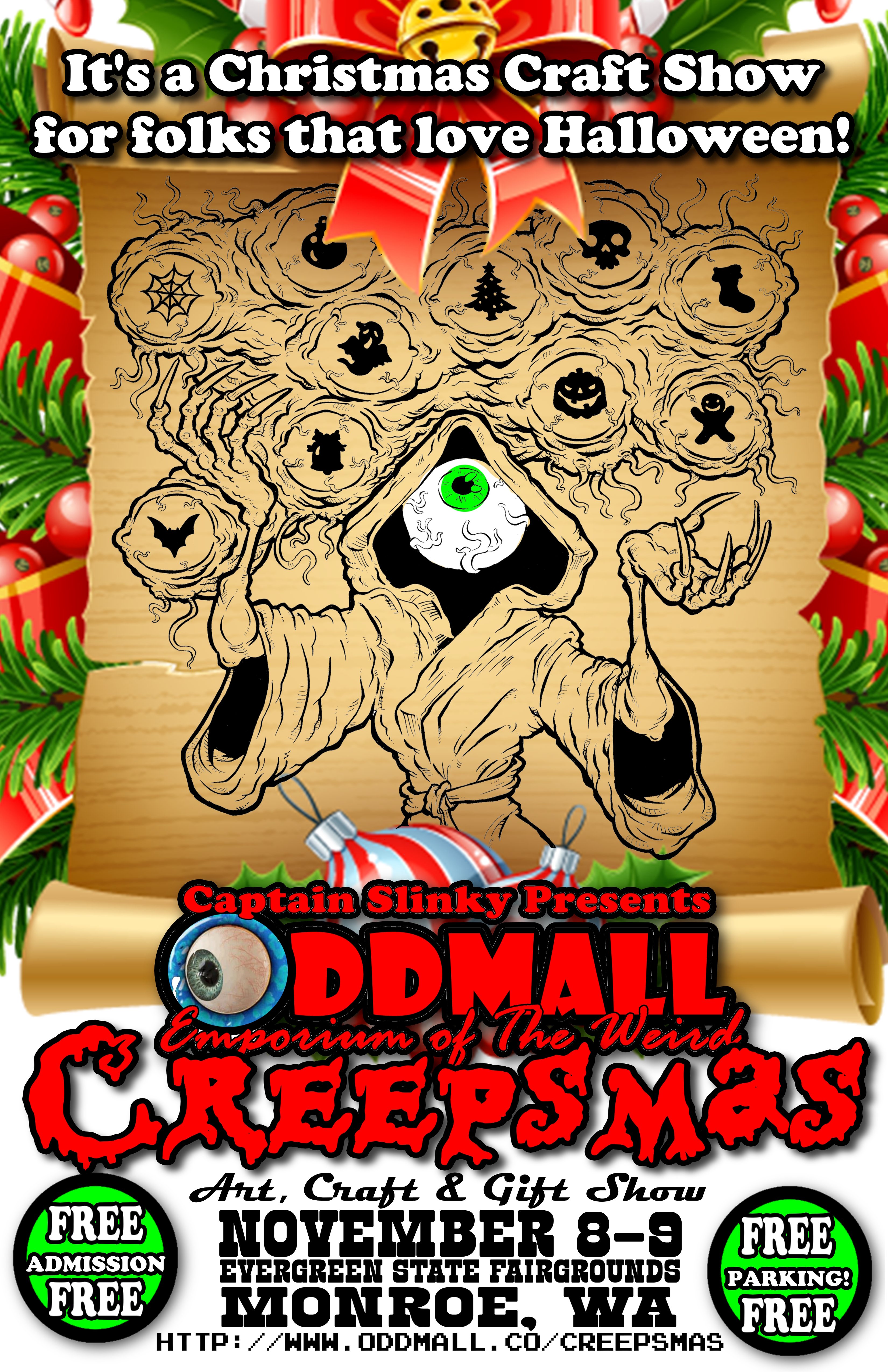 Save the dates! November 8-9 at the Evergreen State Fairgrounds in Monroe (Washington), it’s the great big Captain Slinky Presents Oddmall Emporium of The Weird CREEPSMAS Art, Craft & Gift Show! It’s the perfect place to get the perfect gift for the perfect person in your perfect life that’s perfectly difficult to shop for! Over 170 local Artists, Crafters and Captain Slinky Approved Vendors (mostly toys and games) with a decidedly “Alternative” tone.