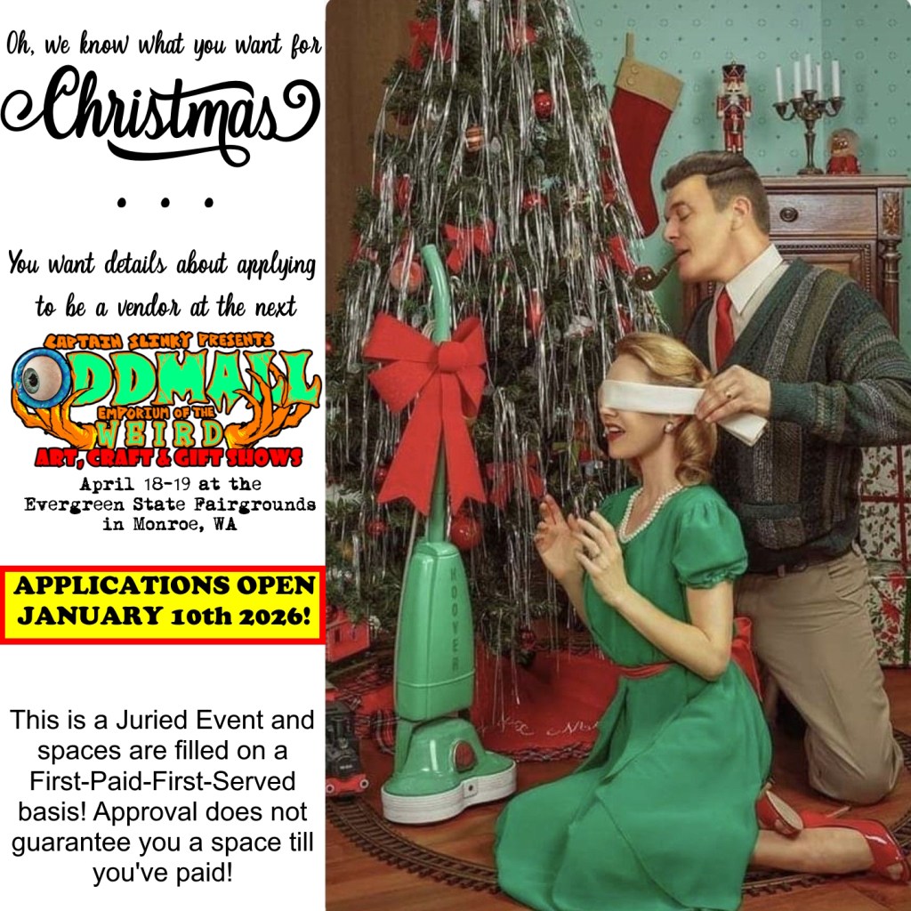Captain Slinky Presents Oddmall Emporium of The Weird SPRUNG Art, Craft & Gift Show April 18-19 at the Evergreen State Fairgrounds in Monroe, WA will start accepting new vendor applications starting at NOON on SATURDAY JANUARY 10TH! This is a juried event, and we fill spaces on a first-paid-first-served basis – getting approved DOES NOT guarantee you a space in the show till you’ve paid! Just keep an eye on our social media accounts for the link once we post it!