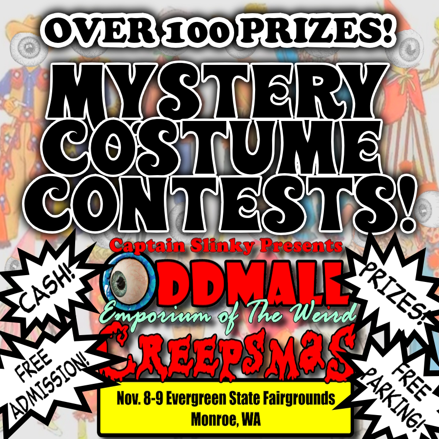 THE EASY VERSION: Wear an approved costume (see Official Rules below) to the Captain Slinky Presents Oddmall Emporium of The Weird Creepsmas 2025 Art, Craft & Gift Show at the Evergreen State Fairgrounds in Monroe, WA. Find the Oddmall Headquarters at the back of the room and have them take your picture, which we will post on our Oddmall social media accounts for all to see. Fill out the official Entry Form (which will ask you for your name, age, costume and a way to contact you if you win) and give it to us. We then check The Big List Of Prizes to see if you won one of over 100 Costume Contest Prizes, and THAT’S IT! No entry fee! No walking out on a stage! No Costume Parade! Just show up in a costume, fill out the form, take a pic, get a prize, DONE! Winner will be announced and contacted before Thanksgiving!