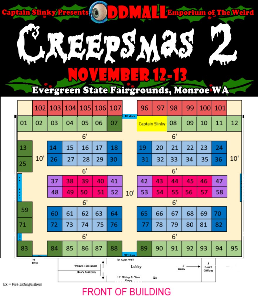 WE ARE OFFICIALLY SOLD OUT FOR THE CAPTAIN SLINKY PRESENTS ODDMALL EMPORIUM OF THE WEIRD CREEPSMAS 2 “BETWEEN-THE-HOLIDAYS” ART, CRAFT & GIFT SHOW NOVEMBER 12-13 2022 AT THE EVERGREEN STATE FAIRGROUNDS IN MONROE, WASHINGTON!