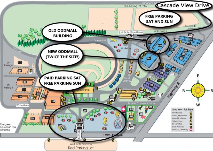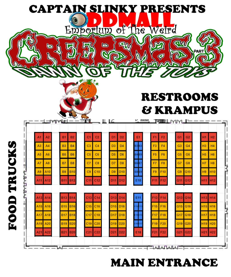 The Captain Slinky Presents Oddmall Emporium of The Weird “Merry Creepsmas” event will be located at The Evergreen State Fairgrounds Gary D. Weikel Event Center – Building Number 604 in Monroe, Washington. Right next door to the OLD Oddmall building which was The Don Britton Livestock Pavilion – Building 600. So anyways, SOMETIMES the Google Maps gives weird directions on how to get to our exact building, so just look for the signs. If you turn off US Highway 2 at Cascade View Drive? That’s your most direct route. But really, just follow the signs and you’ll be good!