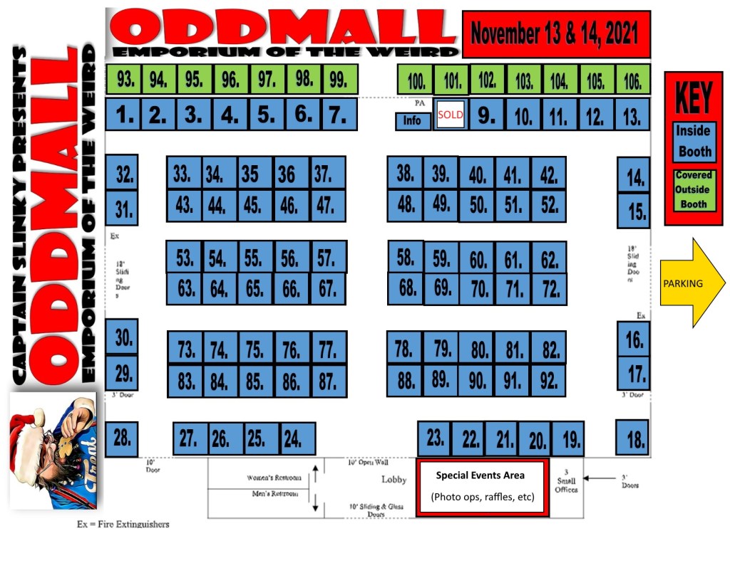 I, Captain Slinky, am personally an “At Risk” individual and am accustomed to taking some pretty severe precautions whenever dealing with The Public and you can expect my personal lifestyle to be applied to Oddmall. We have not yet solidified our COVID-19 Protocols for this event because we want to comply with all State and Local mandates, which seem to change on a nearly daily basis! As things are right now, though, here is what you can expect at this show: