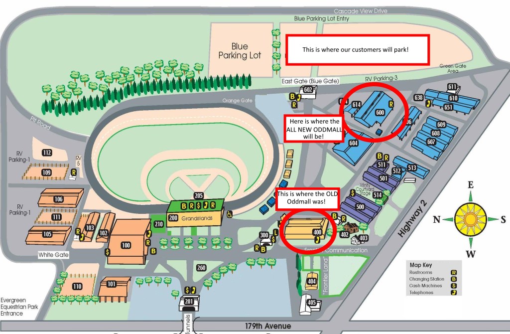 The Captain Slinky Presents Oddmall Emporium of The Weird “Merry Creepsmas” event will be located at The Evergreen State Fairgrounds Building 600 (“The Don Britton Livestock Pavillion”) in Monroe, Washington. The building where the OLD Oddmall had always been held, Building 400 (“The Commercial Building”) is scheduled for demolition before our Oddmall, and I SWEAR I had nothing to do with it! I have an alibi! So anyways, SOMETIMES the Google Maps gives weird directions on how to get to our exact building, so just look for the signs. If you turn off US Highway 2 at Cascade View Drive? That’s your most direct route. But really, just follow the signs and you’ll be good!