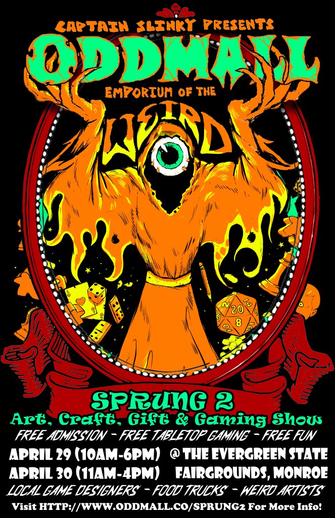 If there’s one thing we Sprung folk love, it’s the indoorsiest of indoor activities – TABLETOP GAMES. Board Games, Miniatures Games, CCG, RPG… we love them all! And now, for the second year in a row, the Captain Slinky Presents Oddmall Emporium of The Weird will be hosting a GAMING EVENT! We have at least 220 feet of tables – possibly MORE – dedicated to Tabletop Board Games, game makers, game publishers and gaming accessories. People selling their old games, people demonstrating new games, people trying to drum up interest for their games on Kickstarter, LOTS AND LOTS OF GAMES! And any spaces NOT being used for that? Will be used for playing MORE GAMES!!!