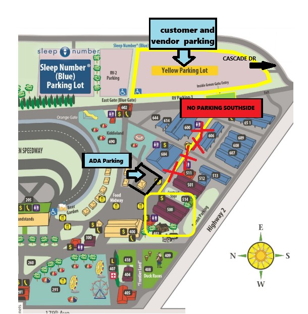 NOTE: Vendors who require ADA parking – there will be marked spots immediately outside our building. There is limited parking on the North side of the building, if you are able to park there instead of in the ADA spots, it is preferred to keep those open for customers. IF YOU DO NOT HAVE ADA PARKING OR PHYSICALLY NEED TO BE CLOSER, YOU WILL NEED TO MOVE TO THE YELLOW LOT. ABSOLUTELY NO ONE MAY PARK SOUTH OF OUR BUILDING (SEE ANGRY RED X’S BELOW)