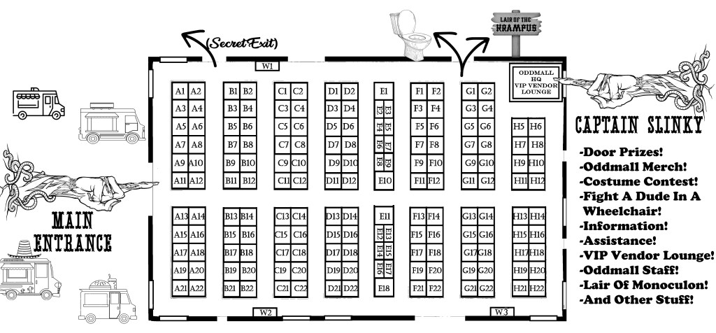 NOW FEATURING TABLES AND CHAIRS! Here you will find a numbered map of the building and an alphabetical list of our vendors so you can find your space easily, as well as the number of tables and/or chairs you requested ($15 per table, $5 per chair) – now you can check and make sure we have your tables and chairs ready to go! If we DON’T have you marked down for any tables or chairs but you NEED tables and/or chairs, now’s your chance to fix that – just click the order form at https://form.jotform.com/243038204579054 (or on the picture of the map below) and we’ll take care of it! Please note that some of you had multiple business names, so please check all your possible before going “But what about MEEEEE?!?” After the Alphabetical listing, there’s a list of everybody by Space Number so you can see who your neighbor is! And that brings us to the end of our Vendor Packet. If you have any other questions, you know how to get hold of me 😉